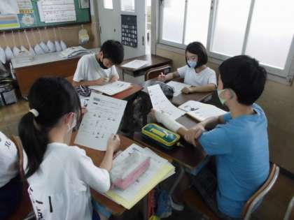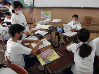 グループごとに役割を決めて,各曜日の時間割についてたずね合いました。What do you have on Wednesday? とたずねると,時間割を見ながら I have 〜 on Wednesday.と答えることができました。