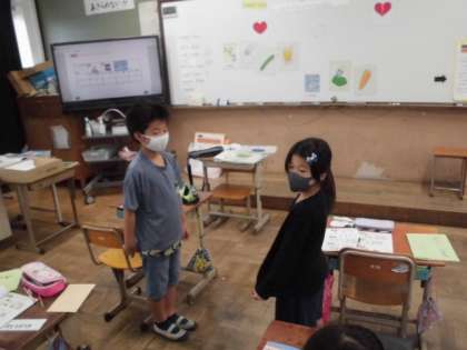 相手に水泳やジュース等いろんなものについて好きかどうか尋ねるための「Do you like 〜.」という表現に慣れ親しみました。お互いの好きなものを予想してから,英語で尋ねるようにしました。繰り返していると,だんだん自信がついてきているようでした。