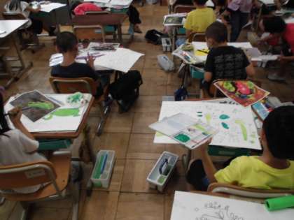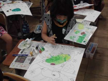 練習が終われば,本番です。水の量に気をつけながら生き物や木,葉の色を塗りました。筆だけでなく指を使って感じを出している子もいました。
