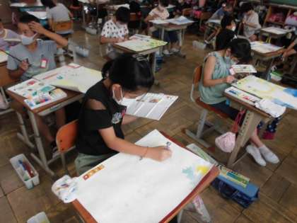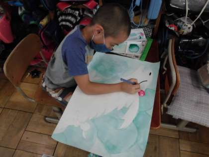 背景を薄めに塗り終えると登場している龍を塗りました。息を静かにしてはみ出さないように慎重に筆を動かしていました。