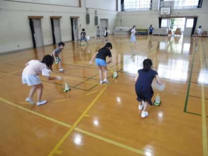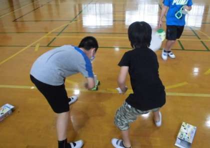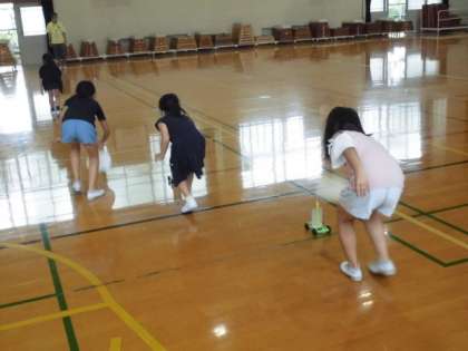 これまでの学習を生かして体育館で車を走らせました。後ろからうちわであおぐと前に進みますが,縦や横にあおいで早く走るように工夫していました。
