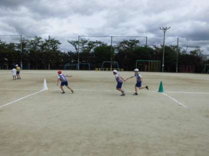 リレーでは,できるだけスムーズなバトンパスをするとタイムは縮まってくるのですが,なかなかうまくいきません。チームで何度も練習を繰り返して息の合ったバトンパスを目指しています。