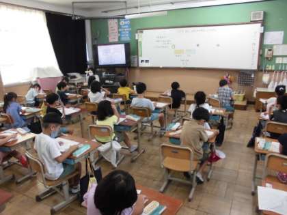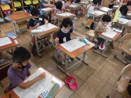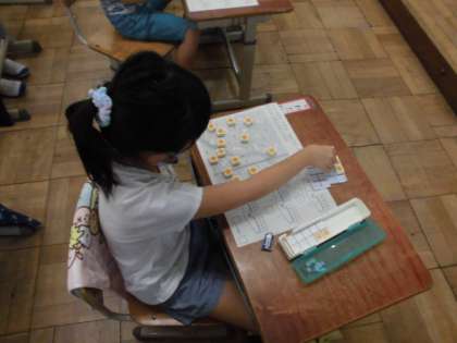 プリントには,きのこやうさぎがいっぱいのっています。数を数えるためにはどうすればいいか考えました。指で1つずつ押さえながら数える方法も出ましたが,今日は,数図ブロックを使うことにしました。うさぎの絵の上にブロックを置いていきました。どうやら10より多くなりそうです。そんな時,「10と3で13だ」と気づいていました。