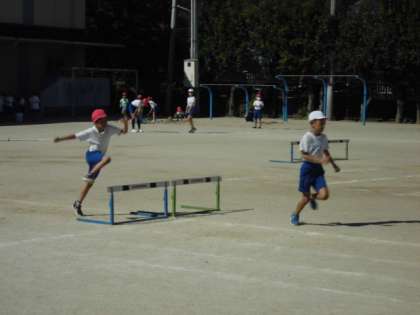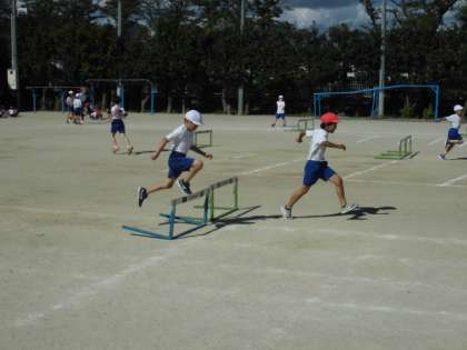 タイミングを合わせてハードルを跳ぶのは難しいです。あまり跳びすぎると空中にいる時間が長くなり,スピードが上がりません。かといって,ハードルぎりぎりをまたぎこそうとすると,引っかかるかもしれません。スピードを落とさないように走り抜けられるタイミングをいろいろと試しながら挑戦していました。