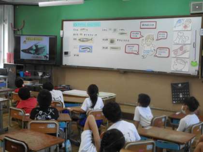 4校時,1−1に栄養教諭も入り,「さかなとなかよくなろう」をテーマに学習しました。