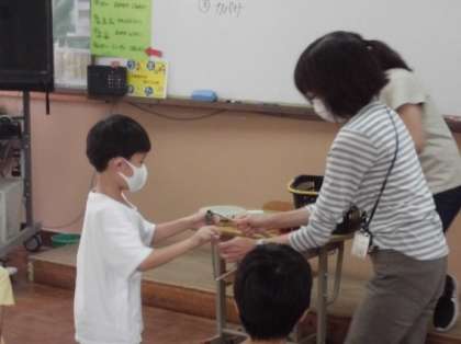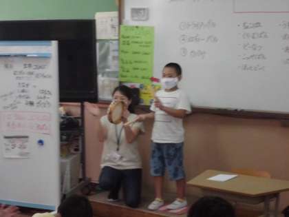 自分の好きな楽器を受け取った後は,歌に合わせてリズム打ちをしました。パン屋さんにあるパンかどうか考え,あったら楽器を鳴らしました。