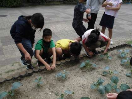 苗を植えた頃より少し大きくなってきました。当然,虫がついたり雑草が生えたりしてきます。収穫までの間,みんなで協力して世話をします。地道な作業ですが,手間暇をかけることで大きくそして美味しく成長してくれることでしょう。
