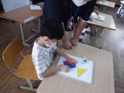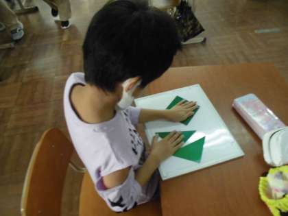 三角形の色板を使って,四角形を作りました。2枚の時はすぐできましたが,4枚で作るとなると,そう簡単にはできません。色板をくるくると回したり移動させたりしながら考えていました。
