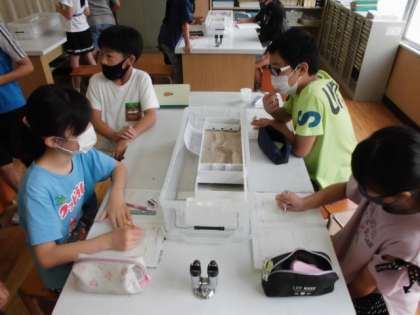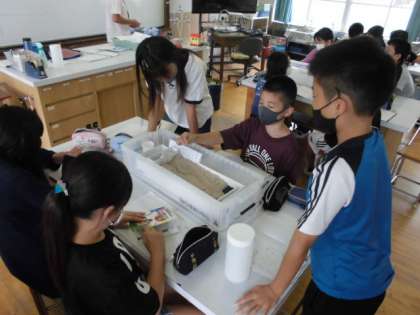 たくさん雨が降った後の川と普段の川の様子から流れの速さなどによって,違いがあるのか実験しました。川に見立てた模型に水を流してみると,曲がっているところが少し削れていました。
