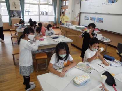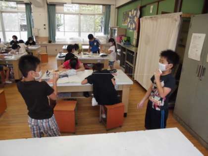 音はどうして伝わるのか,糸電話で実験しました。たたいたりこすったりしたときの様子から,糸が震えていることに気づきました。