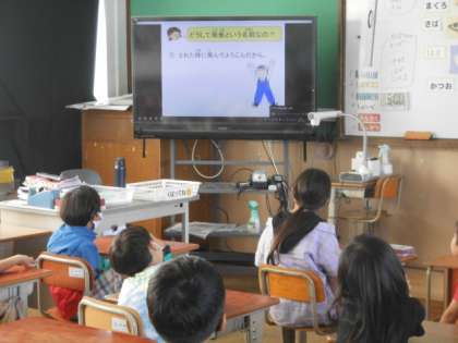 4校時,2−2で「さかなとなかよくなろう」をテーマに栄養教諭も入り,学習しました。