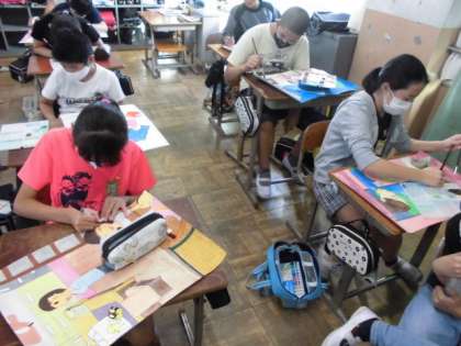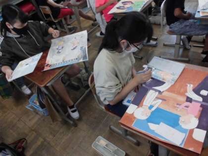 イメージを膨らませて下絵を描く段階から丁寧に進めてきたお話の絵ももうすぐ完成しそうです。背景を塗ったり輪郭をなぞったりする細かい作業も上手にできていました。最後まで集中して仕上げて欲しいです。