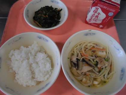 『かやくうどん』の「かやく」は,漢字で「加薬」と書き,もとは薬の効き目を高めるという意味があります。今では,料理をより美味しく食べるために加えるものとして使っています。今日の給食では,けずりぶしでとった出し汁・椎茸の戻し汁・みりん・醤油で鶏肉・油揚げ・細ねぎ・人参・椎茸に茹でたうどんを加えて仕上げました。