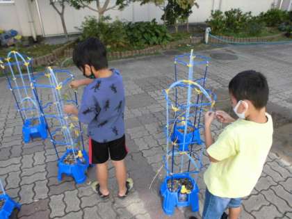 あさがおのツルが枯れてしまったので,輪っかにしてリースを作ることにしました。今日は,2組さんが挑戦です。自分のアサガオからそーっとツルを巻き取りました。
