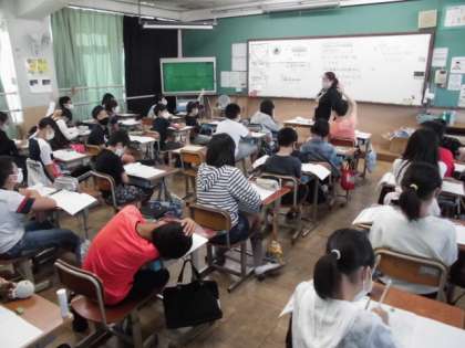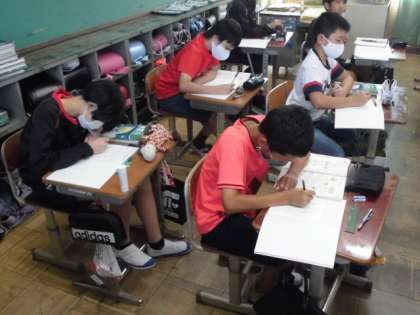 円の面積を求める方法を学習しました。円を細かく切って組み合わせてみると,円周と半径が使えることが分かり,面積を求める公式を導き出していました。早速,公式を使って面積を求める問題に取り組んでいました。