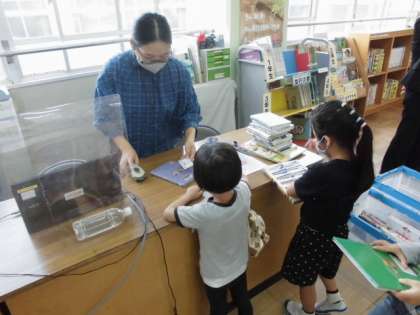 自分の気に入った本が見つかったら,カウンターで本を借ります。借りる方法にも慣れてきたようで,スムーズに本を借りることができました。
