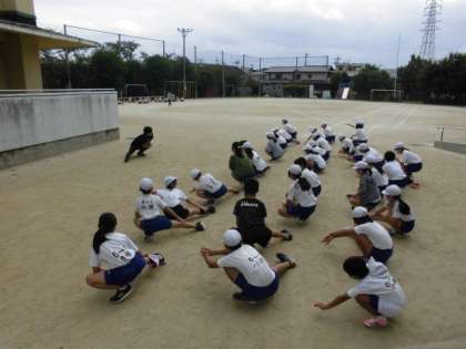 100m走の前には準備運動をします。スタートの場所が狭いので,半分に分かれて体操しました。スムーズに走る順番で並ぶことができていました。