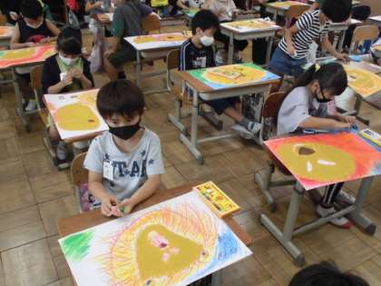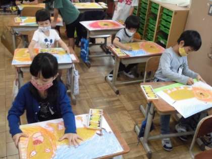 お話の絵ももうすぐ完成です。今日は,背景をクレパスで塗りました。草原をイメージし,風になびく草を表現できるように向きを考えて塗っていました。