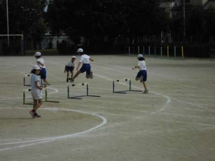 4年生はミニハードル走をします。自分の走りやすいインターバルに調節した後,できるだけ速く走り抜けられるように挑戦しました。