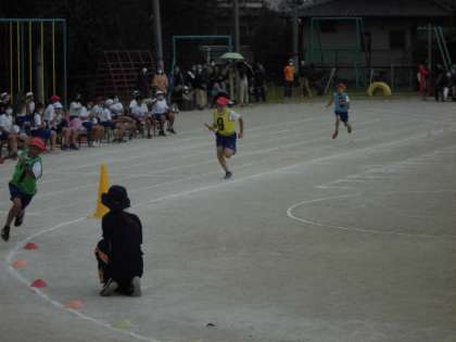 5年生のリレーです。練習してきたバトンパスがとてもスムーズにできていました。仲間を信じて前を向いてバトンをもらうことで,スピードを落とさずにつなげられました。