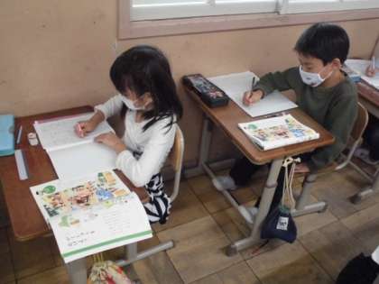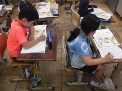教科書の挿絵を見て,学校の様子を伝える文を書きました。「一年生が友だちを待っています」という例文のように「〜は」とか「〜を」をきちんと書くように気をつけました。