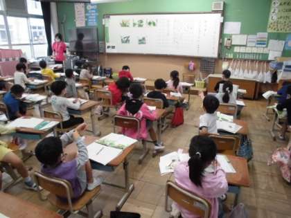 ノートに題名や作者などを書いた後,挿絵を見ながらどんなお話か確かめました。教科書を読みながらお話の流れを考えました。