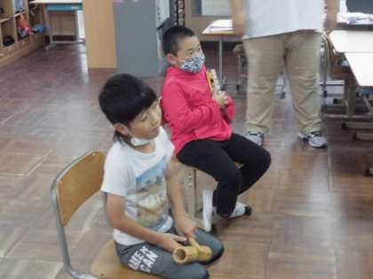 自分で気に入った楽器をもって,順番にリズム打ちしました。「にんじん」「いちじく」など文字の数だけたたきます。いろんな言葉を言いながらリズムよくたたけました。