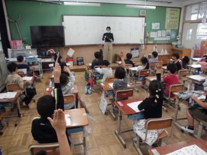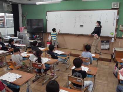 「レモン」や「カメラ」などカタカナをきれいに書くためにどんなことを気をつければいいか話し合いました。止めるところや払うところを意識して書けばいいことが分かりました。その後,丁寧にカタカナを書いている姿が見られました。