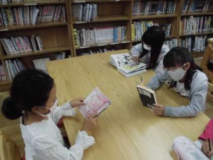 図書館に行って本を借りました。表紙を参考にしながら探していましたが,自分の気に入った本がなかなか見つからなくて困っている子もいました。いろんな本を手に取って読み,いろんな本の世界に出会ってほしいです。