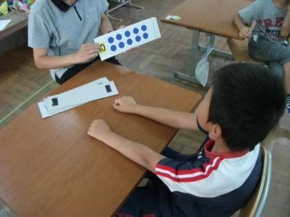 今日は,算数タイムで引き算をしました。10−2 8−1 など10問です。