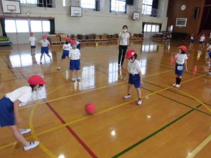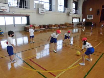 グループに分かれてボールを転がして遊びました。相手に取られないように転がしてパスをするのですが,なかなかうまくいきません。コースを読まれないように素早くパスしていました。