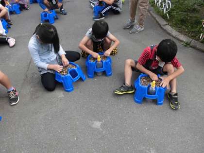 1年生になって種をまき,水やりして育てるときれいな花が咲きました。その後,種ができ,枯れたつるを使ってリースを作りました。アサガオはどのように成長していくのかよく分かりました。きっと1年生みんなの思い出になってくれることでしょう。今日は最後に残った根をとり,土を返して植木鉢をきれいにしました。