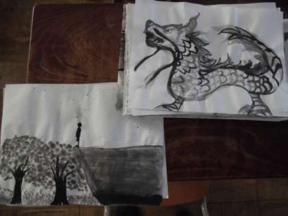お話の絵では,絵の具を使っていろんな色を塗りました。昔の人は墨の濃淡で表現していたことを学習したので,今日は,自分たちもいろいろな方法を試しながら墨の濃淡を利用して絵を描くことに挑戦してみました。水の量を調節しながら,雰囲気のある絵を描いていました。