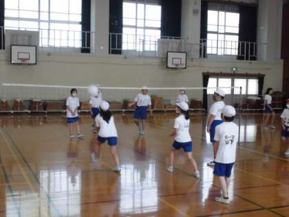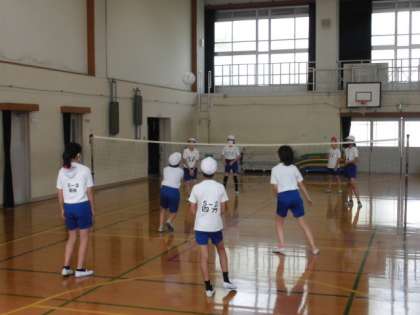 ネットを張ってコートを作り,つなぐことを意識してソフトバレーボールの試合をしました。相手からボールが返ってくると,慌ててしまいます。それでも落ちそうなボールを追いかけたり一緒に喜んだりしていい雰囲気で楽しめました。