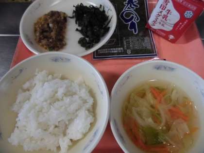 子供たちから,「『肉みそ納豆』は,にんにくと納豆がよくあって,ご飯と一緒にのりに巻いて食べたら,とっても美味しかったです。『ほうれん草のおかか煮』は,ほうれん草とかつおが合っていて,とっても美味しかったです。『キャベツの吉野汁』は,キャベツの甘味とシャキシャキした食感が,美味しかったです。」と,感想をくれました。