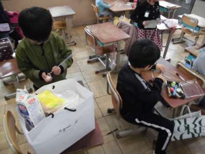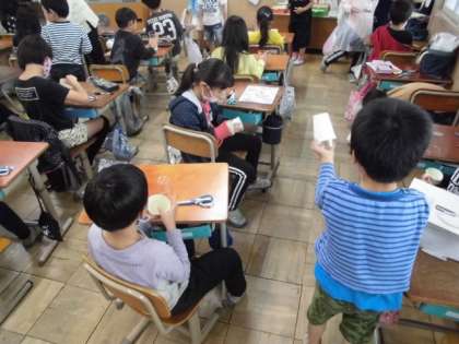 紙コップや輪ゴム,ペットボトルのふた,竹ぐしなどを使って動くおもちゃ作りに取り組みました。動く仕組みを教えてもらった後,実際に自分で作るのですが,なかなか上手くいかないものです。お友達と相談して仕組みが分かると楽しそうに作っていました。