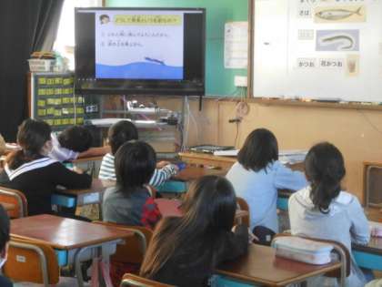 4校時,4−1で「魚の大切さを知り,進んで食べよう」をテーマに栄養教諭も入り,学習しました。