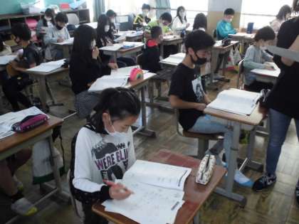 これまで学習してきたことを確かめる復習プリントに取り組みました。答えを確かめながら自分で丸付けをしました。間違えたところをそのままにせず,自主学習などでおさらいするようにして,次は正答を目指してほしいです。