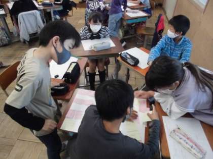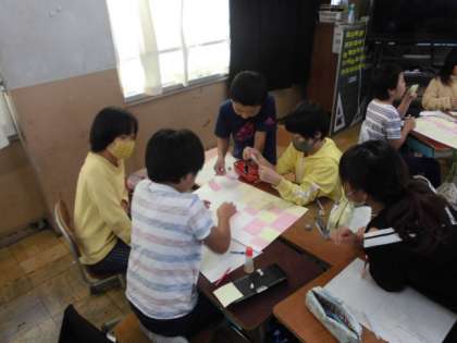 一人でも多くの人にエコライフに取り組んでもらうためには,何を伝えればいいのか考えました。まず,自分の考えを付せんに書き,画用紙に貼っていきました。それをもとに話し合うと,同じ意見があることに気づきました。友達の意見も参考にしながら大事なことを見つけるようにしていました。