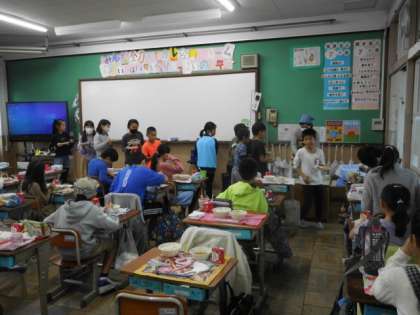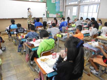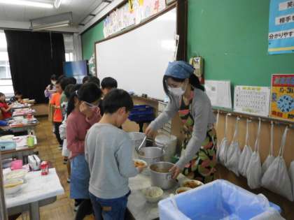 鶏肉のからあげと野菜のきんぴらのおかわりには,たくさんの子どもたちが並んでいました。