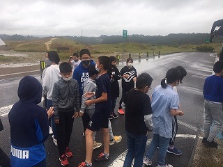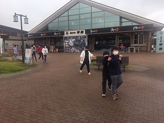 バスで方円館に向かう途中のトイレ休憩の一コマ。雨も上がって,これからの活動が楽しみです。