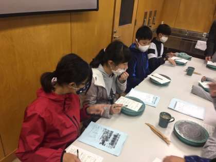 到着時間が遅くなりましたが,方円館に到着しました。これから一つ目の活動,陶芸体験です。まずは作品を送るための申込書を書いています。