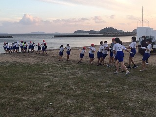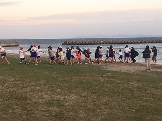 予定より少し遅くなりましたが,日間賀島のサンライズビーチで地引網体験をしました。はじめに説明を聞き,みんなで力を合わせて網を引きました。さあ,何が獲れるのかな?楽しみです。