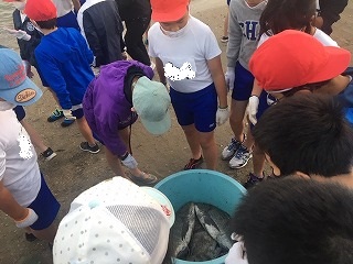 みんなで引いた網の中にはたくさんの魚が! たくさんの魚がとれ,子どもたちも大満足です。