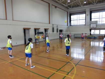 体育の時間にソフトバレーをしています。今日は,チームごとに分かれて試合をしました。できるだけつなげるように声をかけ合い,ボールを追いかけていました。ボールがつながってくると集中力がさらに高まり,チームのために一生懸命動こうとしていました。