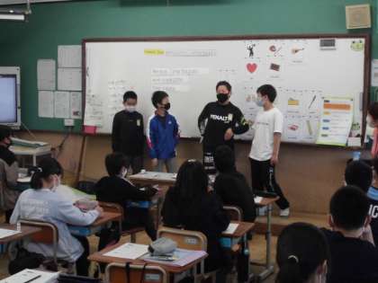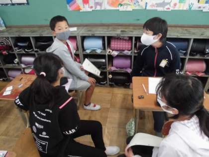「I like 〜」「I want 〜」と自分の好きなものや欲しいものなどについて考えました。英語やイラストで表現した後,グループ内で交流しました。その後,グループ内で1人決めて,その人のことをみんなの前で紹介し,聞いている人達は誰のことを言っているのか答えていました。
