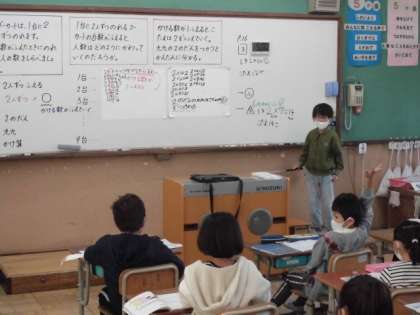 今日の算数では,1台に2人乗れるゴーカートの台数と乗れる人数はどのように変化するのか調べました。1台増えるごとに2人ずつ増えることから九九を使うと求めやすくなることに気づいていました。