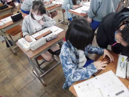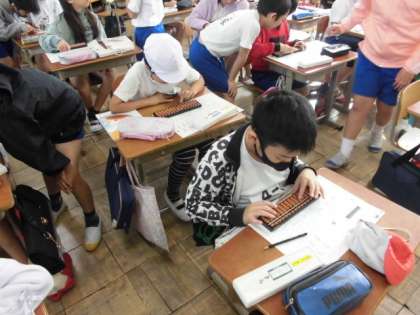 今日は,そろばんの学習に取り組みました。3年生の終わりに休校になってしまったので,初めてそろばんを使う子もいました。玉のはじき方や定位点という馴染みのない言葉に少し戸惑っていましたが,友達の支えもあり計算することができました。