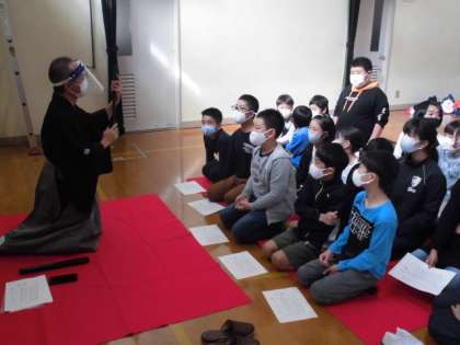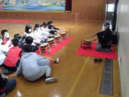 能囃子の方々に来ていただき,能のお話を聞いたり楽器を演奏したりしました。能では,笛や太鼓を使うそうで,子ども達は,しっかり説明を聞いてから積極的に演奏していました。初めて使う楽器なので,少し緊張した面持ちでした。