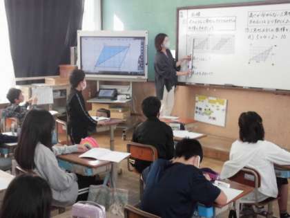 底辺の上の頂点がなく,高さが分からないと思われる三角形や平行四辺形の面積を求める方法を考えました。これまでに学習した公式を使うためには,高さが分からないと求められません。その時,底辺と高さは垂直に交わっていることから,底辺の延長線上におろした線で高さが分かることに気づきました。